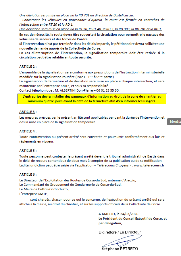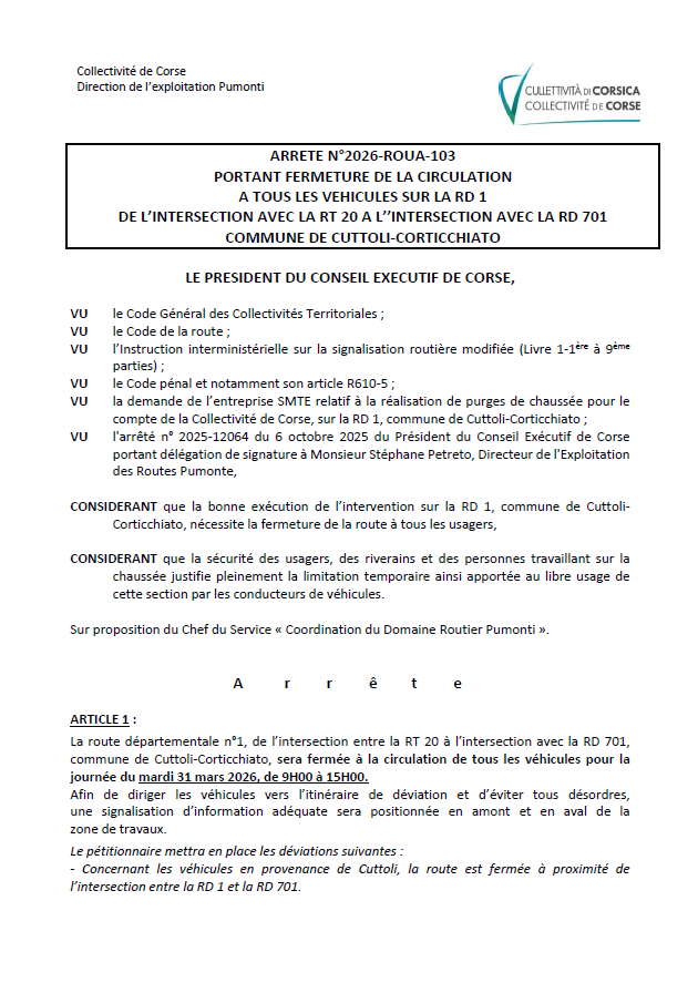 Une restriction temporaire de circulation est mise en place sur la RD 1 du PR 02+640 au PR 09+330, commune de Cuttoli- Corticchiato, le 31 mars 2026, de 09h00 à 15h00 , et à partir de la mise en place de la signalisation temporaire.
